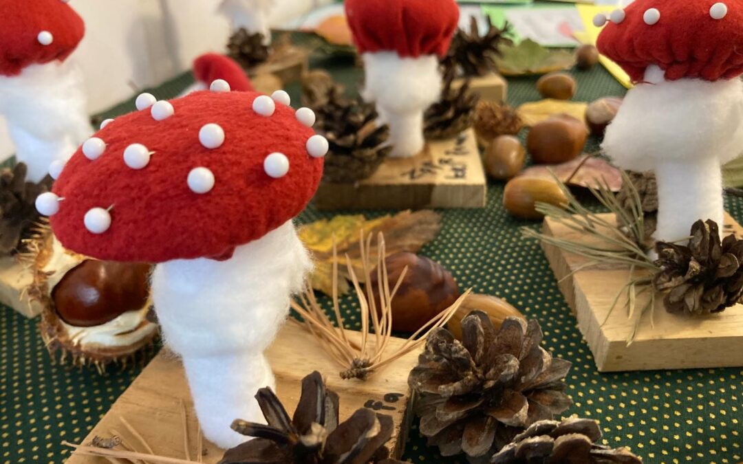Svenska på jobbets kurs ”Skapande svenska”, Café Violen och en fristående skapandekurs ställer under oktober ut sina alster i cafeterian. Du kan läsa om hur språket stärks genom att man får lyssna på instruktioner, träna sig i att fråga när man inte förstår och koppla det handfasta skapandet till nya svenska ord och begrepp. Tyg, piprensare, sockerpasta, muffinsformar, tops, mandelpasta, löv och kottar är några av de material som använts.